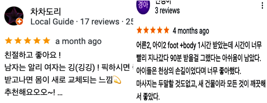 네이버는 창작자에 대한 가치를 이용해 먹기만하고, 구글과 같은 혜택을 주지 않기 때문에, 순수 창작자들의 좋은 글보다, 광고성, 상업적인 의도의 콘텐츠가 판을 칩니다. 해서, 저는 해외여행의 경우, 구글 지도에 있는 후기를 주로 참고합니다. 아래는 시간 순으로 적혀 있던 이곳의 마사지 후기입니다. 구글 맵에 relax corner, soul relax를 치시면 많은 관련 후기를 볼 수 있습니다.