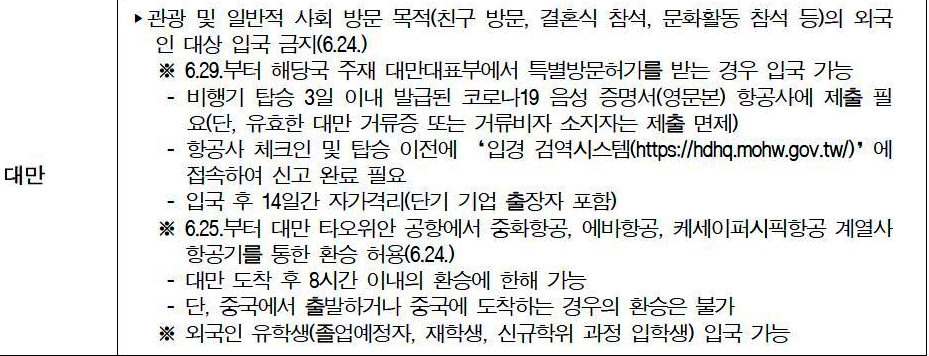 대만은 저 위험 국가와, 중 위험 국가를 분류