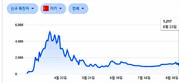 터키 코로나 확진자 수가 23일 자료 입니다.