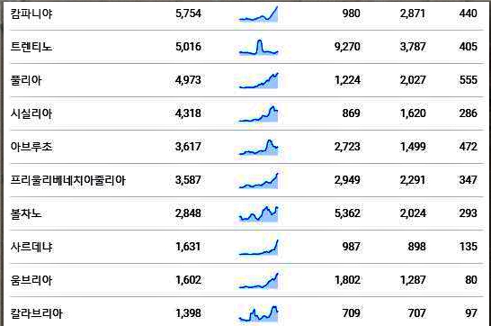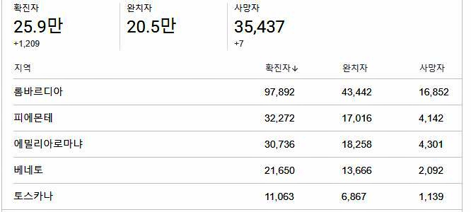 이탈리아 지역별 누적 확진자 자료 입니다.