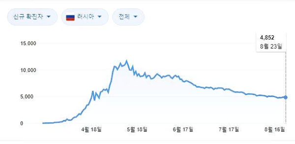 러시아의 일일 신규 확진자는 지난 4월 말 이후