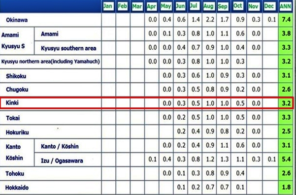 바랍니다. . 오사카 지역은 위로부터 6번째 Kinki 입니다.