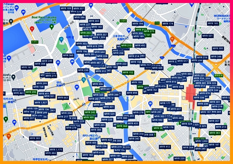 2월은 아이들의 겨울 방학이 시작되고, 여러 나라도 방학이 많이 시작되는 기간이라, 여행업계에서는 1년에 두 번 있는 피크 시즌입니다. 첫 피크 시즌은 여름 방학이 있는 7월부터 9월 초까지, 두 번째 장기 시즌이 12월부터 3월 초까지 입니다. 이 달은 여행객들의 유동 및 예매율에 따라 비행기 티켓 가격과 호텔 예약 비용이 급하게 오르기도 합니다. 이 기간에 여행을 가신다면, 일정을 빨리 정하고, 여행 중에, 가장 비용이 많이 드는 이 두 가지의 예약을 미리 마쳐두는 게 비용 절약에 좋을 때가 많습니다. 아래는 이번 달에 확인한 후쿠오카 시내의 호텔 가격입니다. 비행기 티켓, 숙박료는 변동을 합니다. 해서 확정 가격으로 보지 마시고, 틈틈이 가격 추이를 보고 결정하시기를 바랍니다. 제가 현재 외국에 있어, 이 나라의 환율이 적용된 호텔 가격입니다. 여기에다 300을 곱하면, 1박의 한화 가격입니다.